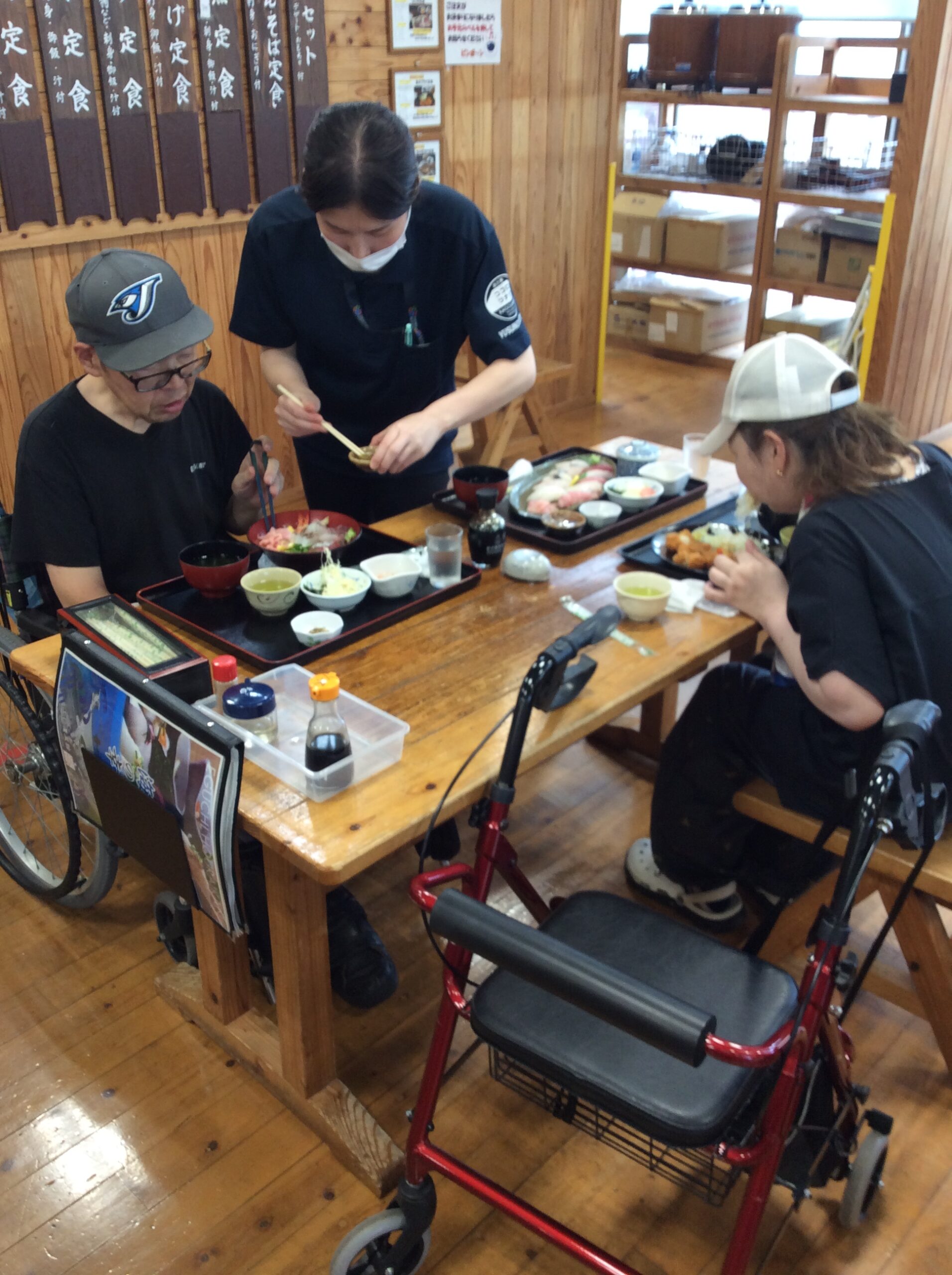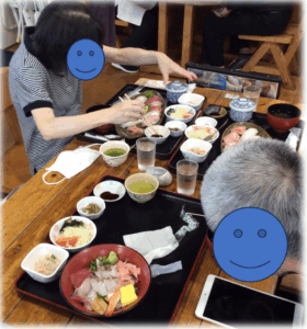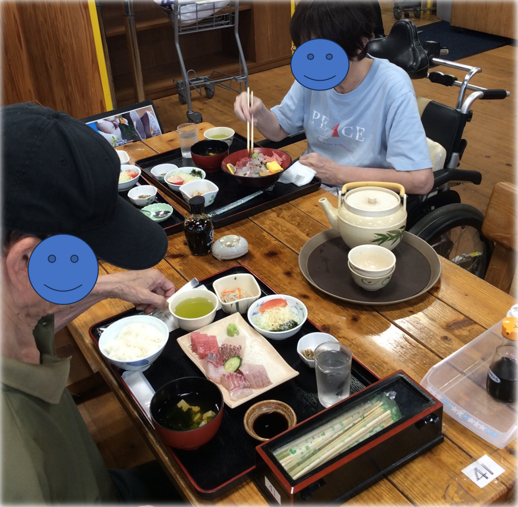 江口蓬莱館では、お刺身やお寿司、海鮮丼など新鮮なお魚料理を堪能され、皆さんの笑顔が溢れていました。