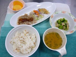 【献立】ツナ×青のりごはん・魚のアーモンド焼き・揚げ豚のジンジャーソースがけ・ブロッコリーサラダ・オニオンスープ・柿