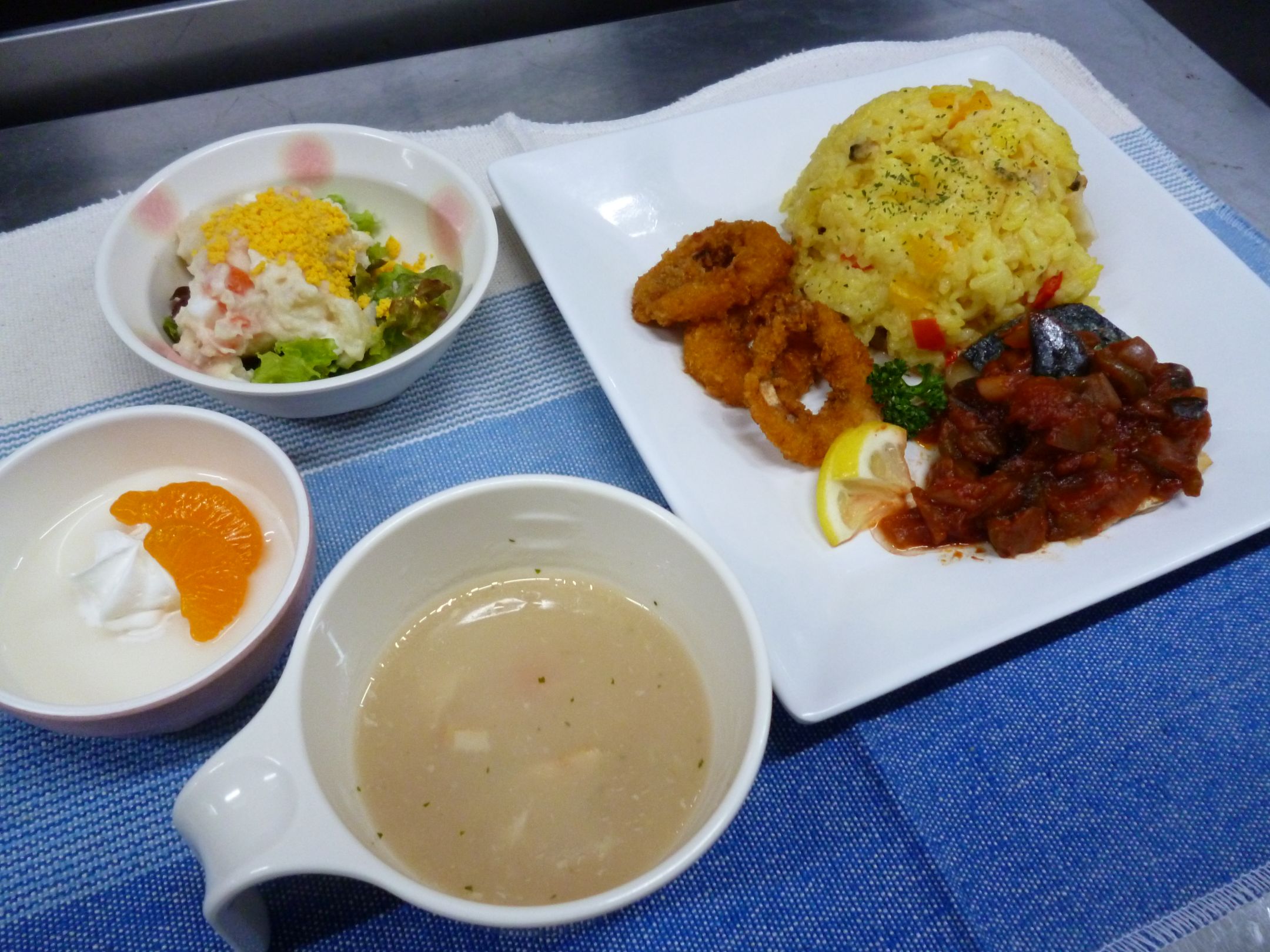 ごちそうランチは第一弾として、6月にアジアのごちそうランチを提供しましたが、今回は、嗜好調査のリクエストでパエリアがあったことをきっかけに地中海のごちそうランチを提供しました。地中海料理はオリーブオイルや魚介類、緑黄色野菜などを多く使用するため身体に必要な栄養素をバランスよくとることができます🍅。良質な脂質やビタミン、ミネラル、食物繊維などを豊富に含むため、心血管の健康サポートや生活習慣病の予防にも役立つと言われています。「お洒落だね!」「初めて食べた」と皆さん喜ばれていました。