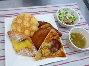 【献立】メロンパン・クリームデニッシュ・餡クロワッサン・ツナマヨネーズ・カレーパン・ミックスピザ(6種から2種セレクト)・・シーザーサラダ・コンソメスープ