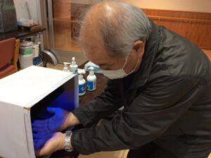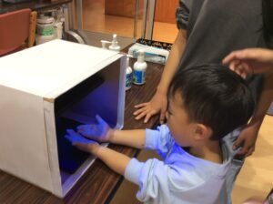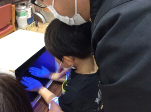 また、手洗いチェッカーを使って、普段の手洗いでどの部分が洗えていないか確認を行いました。