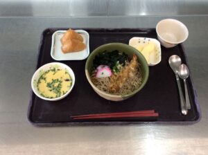 年越しメニューは年越しそばを提供しました。年越しそばの由来には複数の説があり、そばが細く長いことから、長生きや家運が長く続くことを願う意味であったり、そばが切れやすいことから、その年の苦労や災厄を断ち切るという意味が込められているようです。