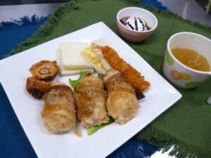 【献立】肉巻きおにぎり・卵サンド・ミルフィーユカツ・エビフライ・ブロッコリーサラダ・オニオンスープ・プリン