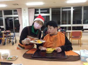 クリスマスメニューは夕食に提供し、クリスマスケーキは3種(ショートケーキorチョコケーキorチーズケーキ)の中から1つ選んでいただきました。チョコケーキが1番人気となりました🍰職員もサンタに変身して、皆でクリスマスの夕食の時間を楽しく過ごすことができました🎄