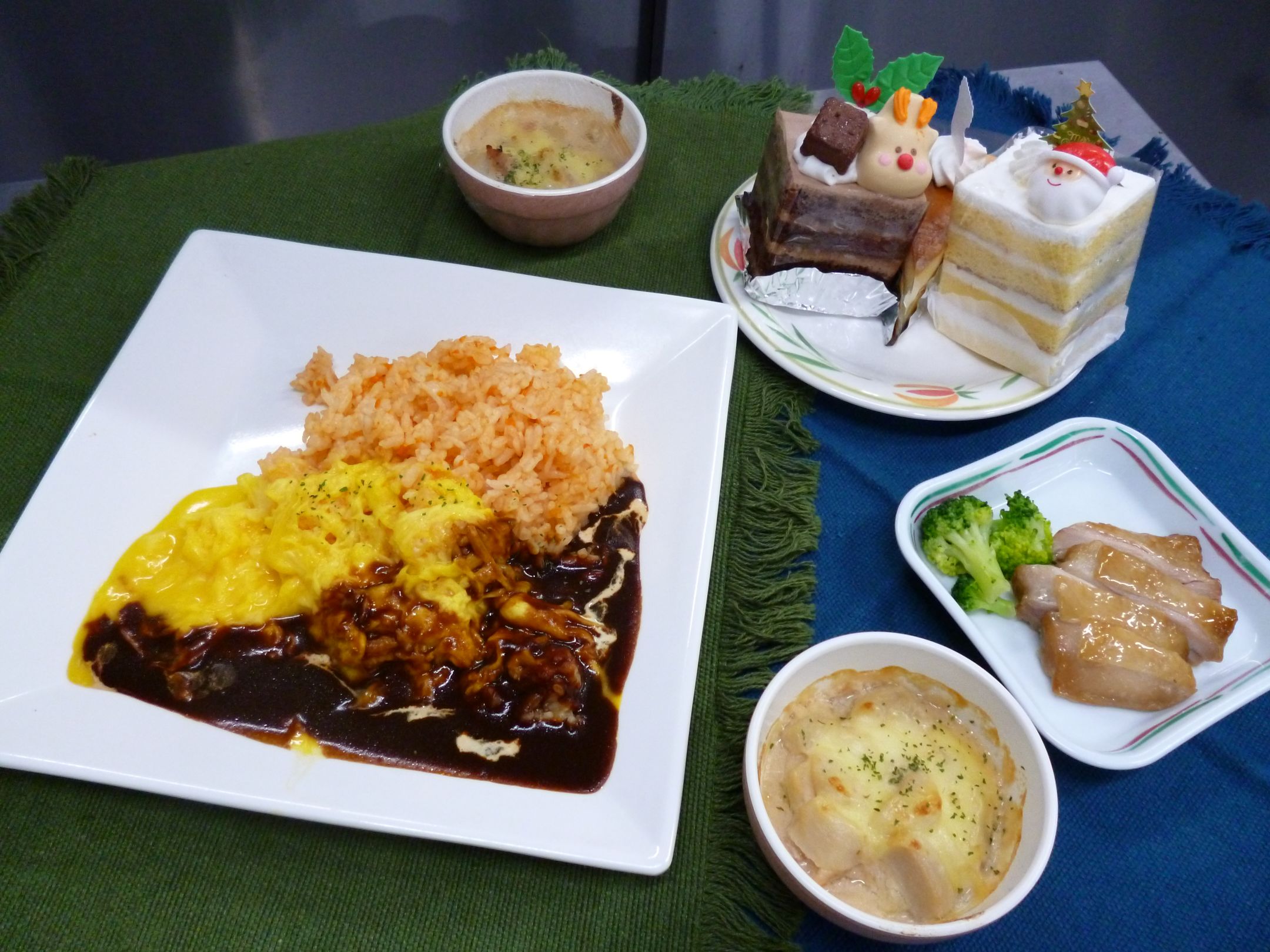 【献立】オムライス・照り焼きチキン・里芋の和風グラタン・コンソメスープ・クリスマスケーキ
