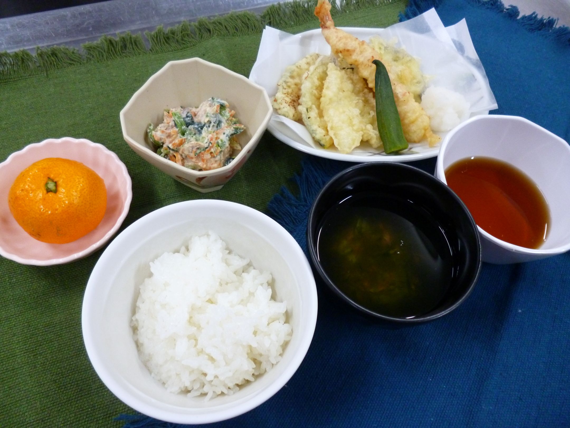 【献立】ごはん・天ぷら盛り&天つゆ・白和え・あおさ汁・みかん