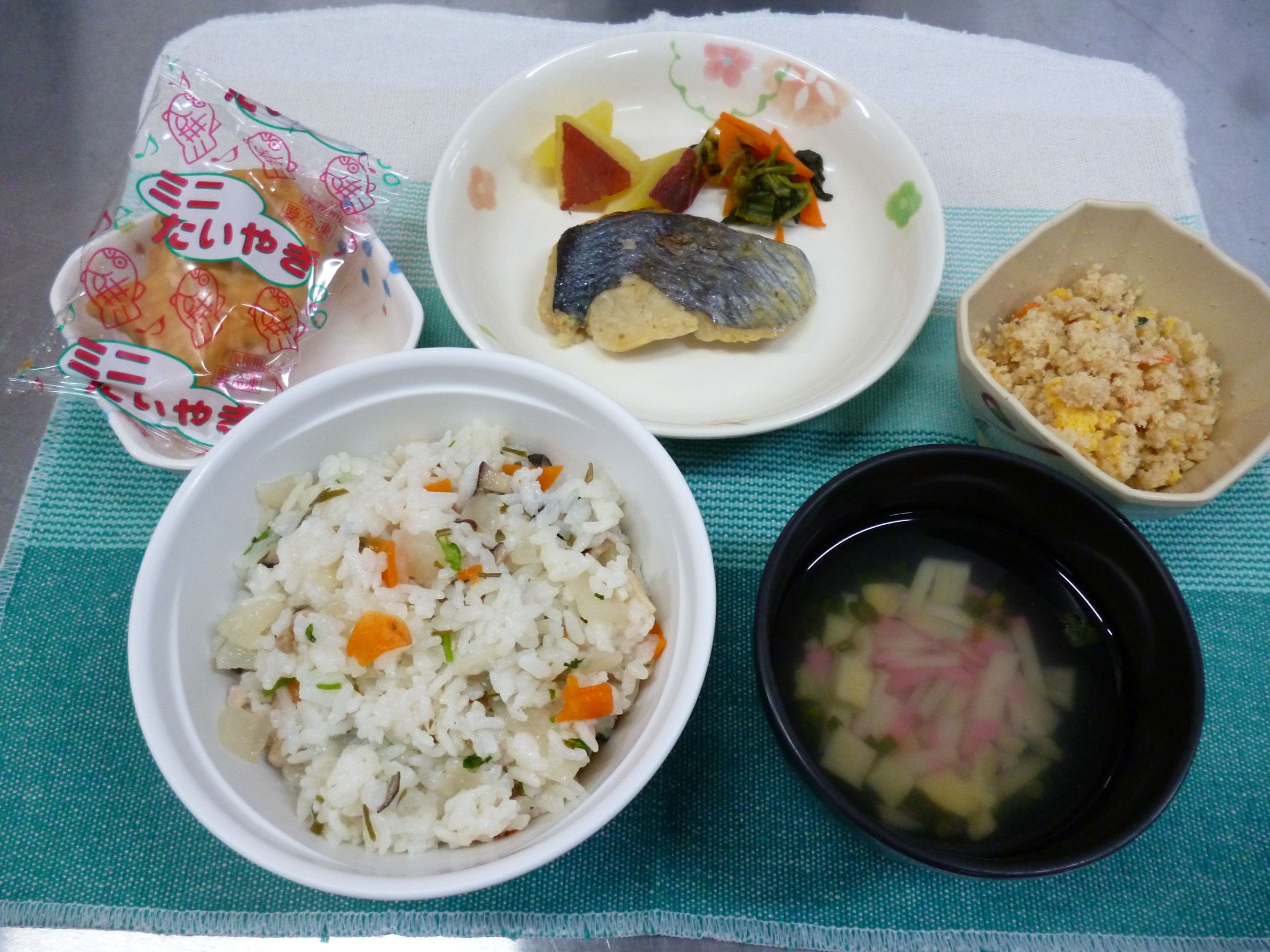 【献立】七草炊き込み・魚のゆず味噌焼・卯の花・清まし汁・ミニたい焼き
