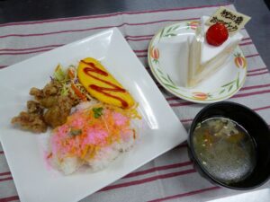 【献立】散らし寿司・鶏のカレー風味唐揚げ・ミートオムレツ・タイピーエン・お祝いケーキ