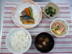 【献立】麦ごはん・鯖の味噌煮・卵豆腐のあんかけ・ほうれん草のじゃこ和え・ぜんざい